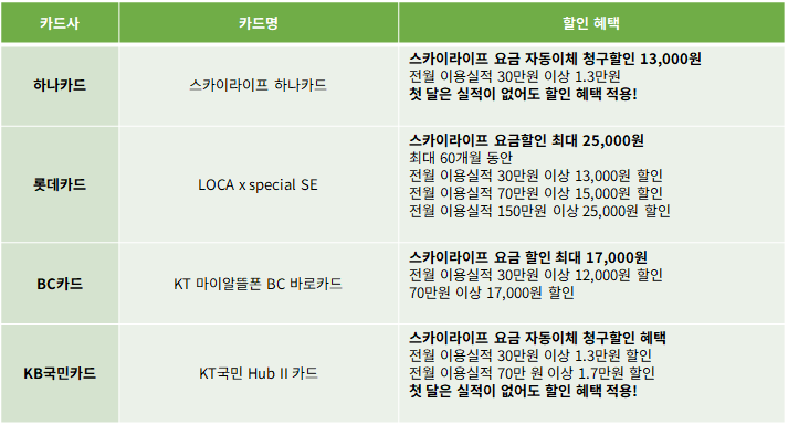 ※ 카드사 혜택은 항시 변경될 수 있으니, 가입 시 사용하고 계신 카드사에 문의하시거나 발급 시 확인이 필요합니다.