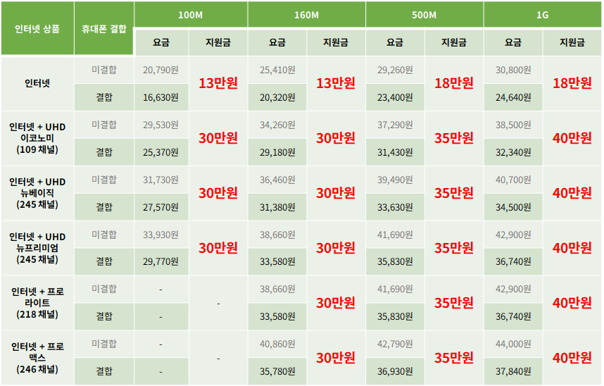 요금표에 명시된 금액은 셋톱박스, 모뎀 임대료 및 부가세 포함 실 납부액입니다.